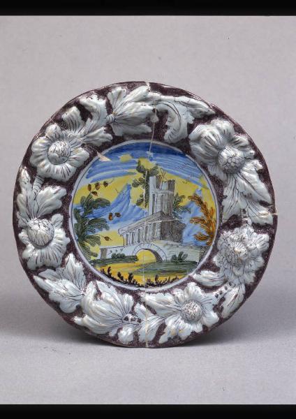 - NOTIZIE STORICO CRITICHE Il piatto, di provenienza ignota, è da far risalire alla produzione ceramica pavese della prima metà del XVIII secolo. Esso presenta corrispondenze con altri esemplari, analogo, infatti, appare il paesaggio scenografico della decorazione centrale.