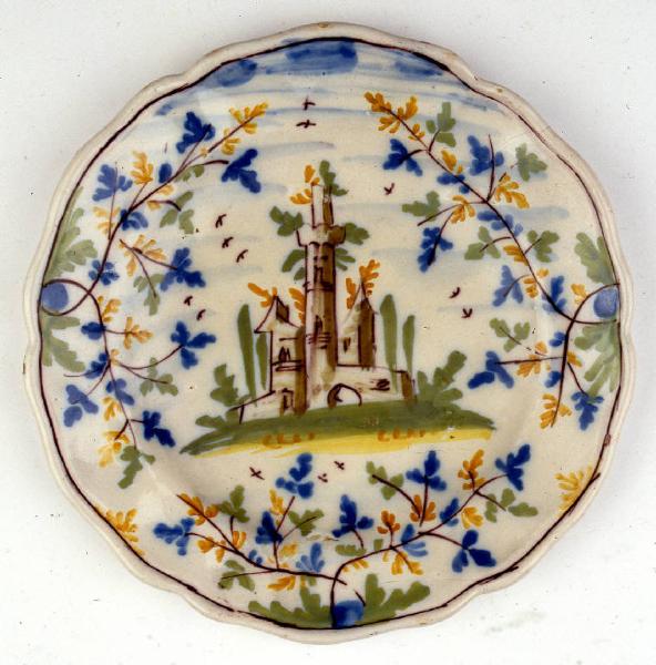 Piatto con tesa a orlo mistilineo e base apoda lievemente convessa.\nAl centro un gruppo di edifici turriti sorge da un'isola di terra con piante; lo sfondo è attraversato da velature che rappresentano il cielo; tutt'intorno, uccelletti schematici in volo. Lungo la cornice: rametti fogliati escono dal perimetro, mentre, in alto, pendono gruppi di nuvole "a goccia".
