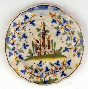 - NOTIZIE STORICO CRITICHE Il piatto proviene dalla collezione privata di Eisner von Eisenhof, che lo acquistò nel 1932. Le maioliche con questa tipologia decorativa appartengono alla produzione pavese, della seconda metà del XVIII secolo, in particolare a quella dei cosiddetti "latesini". L'attribuzione è resa certa dalla presenza dell'iscrizione "Pavia" sul retro di un vassoio ellittico con decoro analogo; l'iscrizione è affiancata da una marca con le lettere "A" e "G", probabilmente da riferirsi alla manifattura di Angelo Maria Guangiroli, comproprietario con i Rampini e conduttore della fornace in Borgo Ticino tra il 1749 e il 1769.