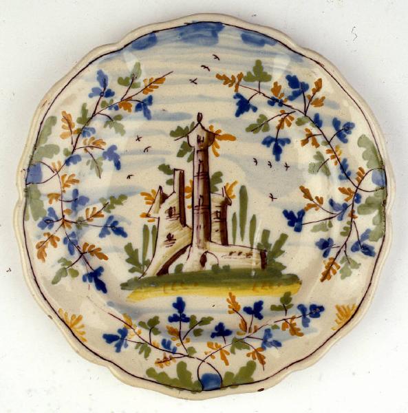 Piatto con tesa a orlo mistilineo e base apoda lievemente convessa.\nAl centro un gruppo di edifici turriti sorge da un'isola di terra con piante; lo sfondo è attraversato da velature che rappresentano il cielo; tutt'intorno, uccelletti schematici in volo. Lungo la cornice: rametti fogliati escono dal perimetro, mentre, in alto, pendono gruppi di nuvole "a goccia".