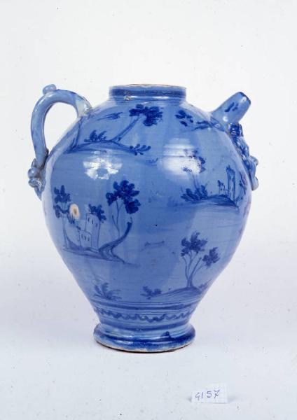 Orcio in foggiatura a tornio, con corpo ovoidale, corto collo cilindrico, cannello con mascherone, ansa binata con terminazione a serpentine divaricate lungo l'attacco inferiore, e piede distinto a disco piano. La decorazione "a tappezzeria" in blu mostra isole di terreno sparse sulle quali sorgono edifici turriti alternati ad alberi e, nella parte frontale sotto il mascherone, una figura di cacciatore seduto. Ai lati dell'attacco inferiore dell'ansa si trovano due coppie di numeri in manganese che, letti insieme, formano la data 1751. Lungo il collo, nel piede e nella parte inferiore del corpo sono presenti dei filetti. Il rivestimento presenta, all'esterno, una cristallina azzurra sovrapposta a uno smalto bianco; all'interno, smalto bianco con una marcata cavillatura. La parte inferiore del piede non è rivestita e mostra l'impronta del distacco dal tornio mediante cordicella. L'orcio è privo di marca.
