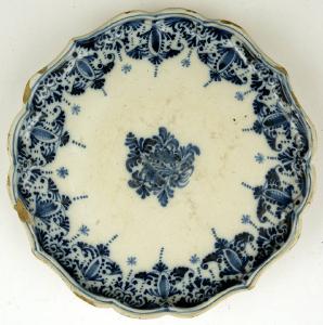 Alzata con profilo mistilineo a quattro punte, bordo rilevato e fondo piano poggiante su un piede a sezione circolare troncoconico svasato. La decorazione in monocromia blu appartiene alla famiglia "a merletto", ispirata ai decori francesi "a lambrequins rayonnants", e presenta, nella tesa, un motivo articolato con "C" intrecciate; lungo gli interstizi dell'ornato si notano file di puntini e asterischi; al centro, un motivo floreale. Sul retro, la superficie smaltata è attraversata da tre tralci fogliati alternati ad altrettanti asterischi.