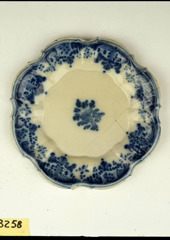 Piatto tondo, con orlo mistilineo, bordo rilevato, tesa baccellata e disegno octolobato nel fondo. Privo di anello d'appoggio. Presenta un modellato con motivo "a merletto" in monocromia di cobalto. Al centro del cavetto è dipinto un solo fiore.