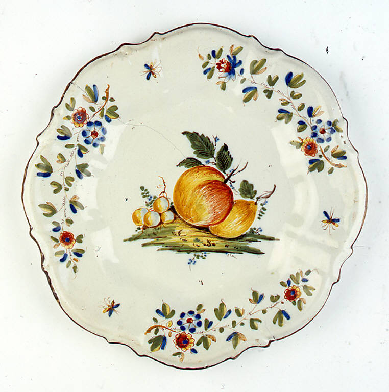 Piatto tondo, dalla tesa baccellata con forma "a coste", privo di anello d'appoggio. L'ornato presenta: lungo l'orlo una profilatura in bruno; sulla tesa, dipinti con grande scioltezza corsiva, un'alternanza di mosconi e tre tralci fioriti; sul fondo dei gruppi di frutti su piano erboso. Il piatto, privo di marca, riporta al centro del decoro, una mela, una pera, qualche acino d'uva con tralci, la stesura degli elementi appare leggera e rigida.