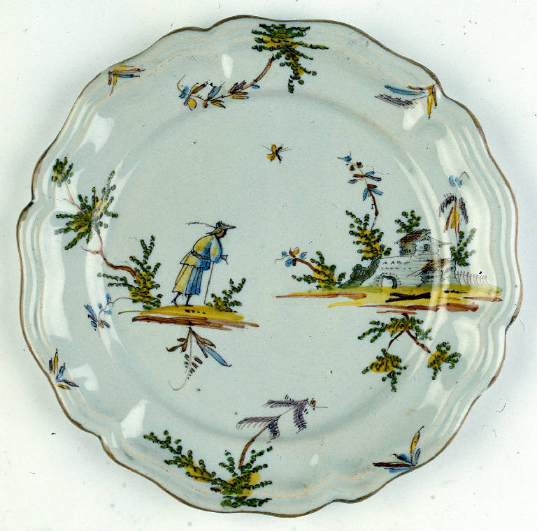 - NOTIZIE STORICO CRITICHE Il piatto, di proprietà del Legato Francesco Ponti, è da far risalire alla produzione ceramica lodigiana, in particolare alla manifattura di Antonio Maria Coppellotti. E' assegnabile alla seconda metà del XVIII secolo. La tipologia decorativa "a paesini e figure" fu tra le più fortunate della ceramica lombarda del XVIII secolo ma, nella seconda metà del 1700, non avendo conquistato la tavolozza a piccolo fuoco, Coppellotti dovrà lasciare la direzione artistica di questo gioco decorativo alle ditte milanesi, tanto che, il piatto qui in esame, sembra riprendere la moltiplicazione delle zolle dei decori "a smalto", tipiche di quelle milanesi.