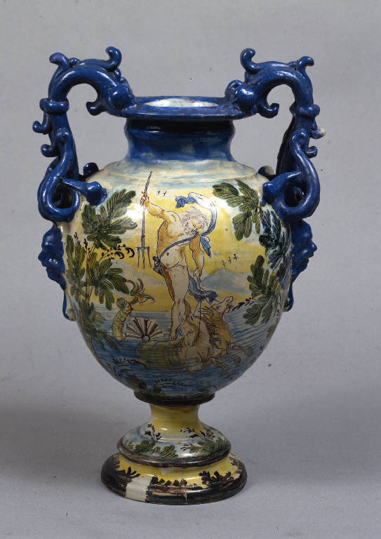 Grande vaso istoriato in smalto azzurrato, con corpo ovoidale, collo cilindrico e ingrossamento mediano, bordo a tesa aggettante, due anse binate sormontanti con creste applicate e terminazione a serpentine lungo gli attacchi inferiori, sotto i quali sono applicati due mascheroni in rilievo. Il piede è distinto a piedistallo, con anello alto e modanato e stelo pronunciato. Nei due prospetti, una decorazione con figure mitologiche complementari, da un lato, Poseidone su un carro a conchiglia trainato da due ippocampi; dall'altro, Anfitrite con un erote in volo recante frutta. Le raffigurazioni, secondo lo schema del decoro "a scenografia barocca", sono affiancate da quinte di alberelli e cespugli con sfondo paesaggistico di monti azzurri. I piedi sono decorati da fasce bordate in manganese con sequenze di cespugli; le anse sono campite in blu, così come i mascheroni sottostanti; bordi e colli hanno campiture blu che sfumano verso il basso divenendo il cielo nuvoloso delle raffigurazioni. Il vaso è privo di marca.