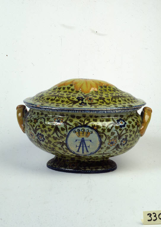 Zuppiera con corpo ovale poggiante su piede, coperchio a doppia calotta e anse ad anello ovale. \nL'ornato presenta decori di fiori e foglie in blu, giallo e manganese su sfondo verde realizzato con l'aggiunta di larghe pennellate gialle sullo smalto berettino. Al centro del corpo, entro un tondo, è riportato, in blu su sfondo celeste, il monogramma "A T F" sormontato da una corona in giallo ocra. Sotto il piede, la marca in blu con il gallo e il numero "30".