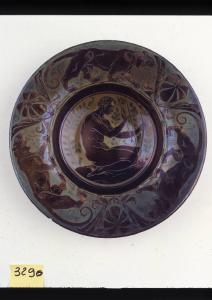 Piatto in maiolica policroma a lustri metallici su base ad anello, con fondo umbonato e larga tesa con orlo liscio. Decorato in bruno su fondo verde-grigio.\nLa decorazione presenta, nel cavetto, una figura di uomo africano nudo inginocchiato, nell'atto di incoccare una freccia nell'arco; nella tesa, tre pantere intervallate da motivi vegetali; sul retro, decorato con fasce lustrali, la marca, quasi illeggibile, con il gallo.