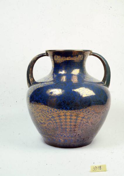 Vaso biansato in maiolica, con corpo globulare, collo alto e largo da cui partono due anse, a sezione quadrangolare, che si appoggiano alla spalla. \nLa superficie in smalto azzurro è decorata con cesti di fiori sparsi dipinti in lustro rosso. Sotto la base, in nero, la marca con il gallo stilizzato e la scritta in tondo "MADE IN ITALY".