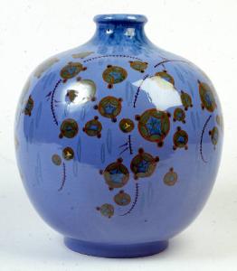 Vaso in maiolica policroma con corpo sferico poggiante su basso piede e collo stretto rastremato. \nLa superficie è decorata, su fondo celeste, da motivi floreali stilizzati in verde e azzurro con profili gialli. con cesti di fiori sparsi dipinti in lustro rosso. Sotto la base, la marca con il gallo stilizzato e una "G" sul lato sinistro.