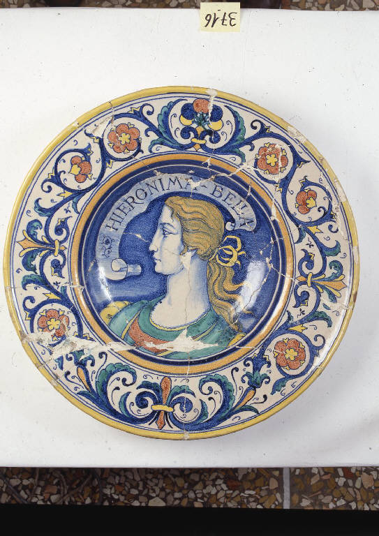 Piatto "da pompa" in maiolica foggiato e rifinito a tornio, con profondo cavetto e larga tesa su basso piede ad anello sul quale sono stati praticati due fori a crudo. L'impasto rosato è smaltato in grigio e i colori usati sono blu, giallo, arancio e verde. \nLa decorazione mostra, nel cavetto, un busto femminile di profilo, la donna ha lunghi capelli raccolti in una coda, tenuti insieme da un fiocco svolazzante; sopra, un cartiglio con l'iscrizione "HIERONIMA BELLA". Nella tesa, un tralcio con girali fiorati e volute che si congiungono nei punti cardinali; l'orlo è anticipato da una doppia filettatura. Cavetto e tesa sono separati da una doppia fascia concentrica. Sul retro, al centro del piede, è visibile la scritta in caratteri cubitali "DERUTA".