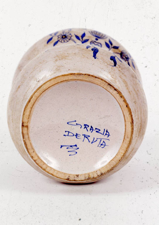 - NOTIZIE STORICO CRITICHE L'albarello è stato realizzato a Deruta, intorno al 1960, da Antonio Margaritelli con manifattura Società Anonima Industria Maioliche Giuseppe Grazia. \nSi tratta di un'imitazione di albarelli derutesi della seconda metà del Seicento, facente parte del corredo della farmacia Cherubini di Deruta che pare commissionasse alla fabbrica Grazia, nei primi anni sessanta del XX secolo, alcune copie, poi eseguite dal pittore Antonio Margaritelli, attivo presso questa manifattura tra il 1952 e il 1970.