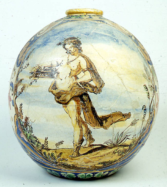 Vaso apodo a corpo globulare con breve collo cilindrico e stretta bocca a collo espanso, foggiato e rifinito al tornio. Modellato con un impasto chiaro e rivestito di smalto leggermente avoriato solo all'esterno, è dipinto in blu, giallo, arancione, verde e bruno. \nLa decorazione presenta, al centro, in ampio medaglione, una donna, allegoria della Primavera, in movimento verso sinistra, con in mano un cesto di frutta e fiori, in piedi su un terreno cespuglioso; ai lati della figura, minuti ramoscelli; nella parte diametralmente opposta, girali fiorati e fogliati sormontati da un motivo geometrico a ventaglio. Nella parte superiore e inferiore corre, entro una stretta fascia filettata, un motivo di foglie lobate.