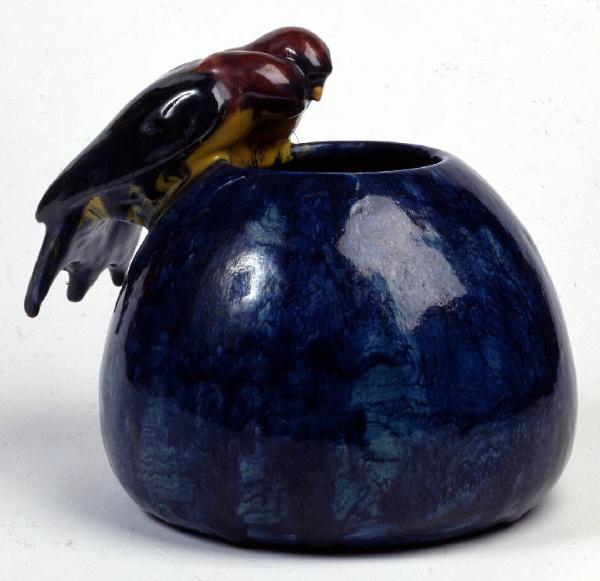 - NOTIZIE STORICO CRITICHE Il vaso è stato realizzato a Roma, nel 1923, da Mary Pandolfi con manifattura fabbrica SIPLA. \nMary Pandolfi de Rinaldis studia all'Accademia di Belle Arti a Roma e frequenta lo studio dello scultore Giovanni Prini. Dopo aver studiato l'arte del ricamo, si dedica alla ceramica. Gli oggetti che realizza negli anni sono caratterizzati da un'importante ricerca plastica di particolari decorativi, i soggetti che sceglie sono fiori e animali che l'artista ha avuto occasione di osservare durante i lunghi soggiorni in campagna. Falchi, rondini, gufi, picchi, uccelli, conigli, lumache e farfalle, rappresentati naturalisticamente nei loro colori, sono foggiati a tutto tondo e appoggiati nell'orlo dei vasi, come nel caso della coppia di uccelli dell'esemplare qui in esame. La sua affermazione avviene nel 1923 quando, in occasione della Prima Mostra Internazionale delle Arti Decorative di Monza, ottiene il diploma di medaglia d'argento del Ministero dell'Economia Nazionale per le ceramiche presentate. È in quest'occasione che il vaso viene acquistato per le civiche raccolte milanesi. Nel corso del secondo decennio del XX secolo, Mary Pandolfi de Rinaldis insegna all'Accademia di Belle Arti di Roma e partecipa, nel 1924, con trentuno lavori, all'Esposizione Nazionale di Ceramica di Pesaro. In seguito abbandonerà ogni interesse nel campo artistico per dedicarsi alla vita religiosa nel convento di Zoverallo (Ivrea) dove morirà nel 1933.