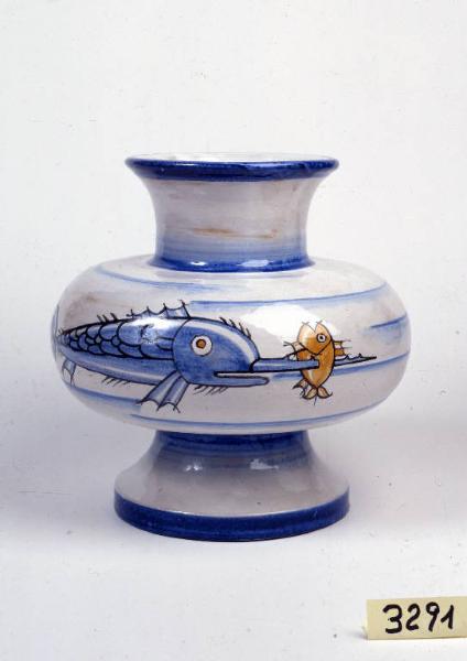 Vaso in maiolica a forma di palla schiacciata su alto piede troncoconico cavo, collo convesso, ampia bocca e orlo estroflesso. \nLa decorazione mostra su fondo bianco, nella parete centrale, un pesce spada in azzurro che infilza un pesciolino giallo. Sulla superficie del corpo è presente una scritta, posta in posizione verticale, in rosso, "VEI". Sotto la base si legge la scritta in blu "R.S.C/CALTAGIRONE/1930".