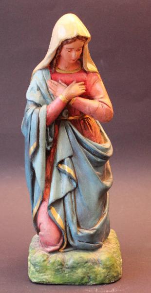 Madonna inginocchiata con il capo leggermente proteso in avanti e le mani incrociate al petto in atto di adorazione di Gesù Bambino. Indossa una tunica talare rosa, tipica dell'antica Palestina, ed un lungo velo azzurro che copre la fronte e le spalle.