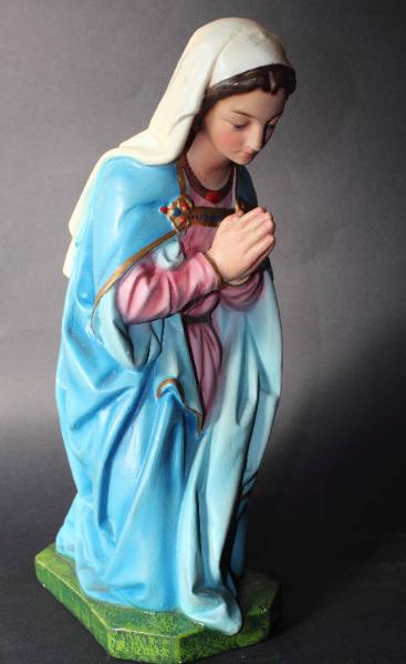 Madonna inginocchiata con manto azzurro, veste rosa e con le mani giunte in preghiera.
