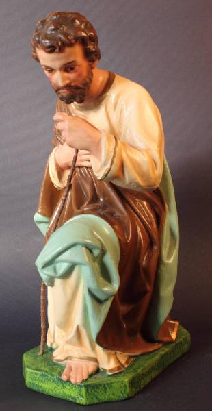 San Giuseppe inginocchiato si sostiene con la mano sinistra ad un bastone, mentre la mano destra è portata al petto in atto di adorazione del Bambino.