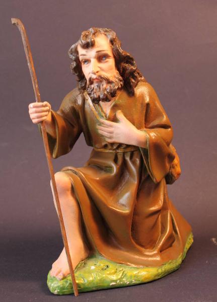 Pastore dalla folta barba inginocchiato in adorazione. Nella mano sinistra regge un bastone.