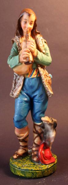 Giovane pastore in atto di suonare un flauto. Accanto a destra vi è un cane ed il cappello rosso del pastore.
