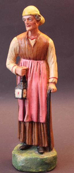 Donna anziana che si sostiene con un bastone. Nella mano destra reca una lanterna.