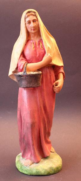 Donna caratterizzata da un velo che le coprie la testa e da un cesto portato al braccio.
