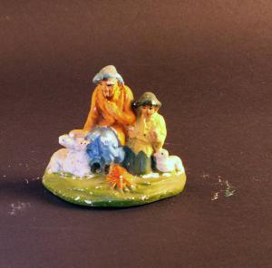 Statuetta da presepio rappresentante una coppia di pastori con pecore davanti ad un fuoco.
