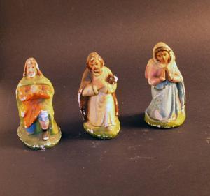 Tre statuette di un presepio rappresentanti la Madonna, San Giuseppe ed un pastore in adorazione.