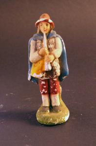 Pastore con manto azzurro e cappello intento a suonare un flauto.