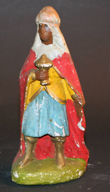 Re Magio moro con mantello rosso recante tra le mani un dono.