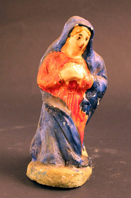 Madonna inginocchiata con le mani giunte sul petto in atteggiamento di adorazione. La figura indossa una veste rossa ed un velo blu.