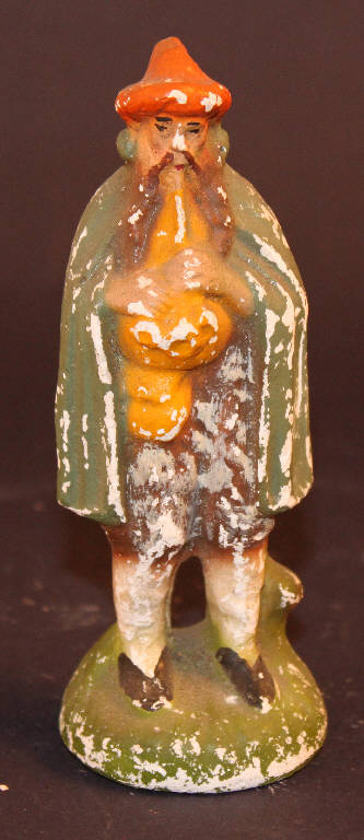 Pastore con mantello verde e copricapo rosso intento a suonare una cornamusa.