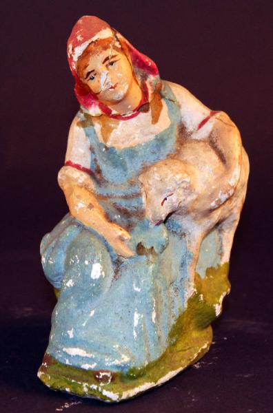 Giovane donna seduta intenta a tenere tra le braccia una pecora. La figura indossa una veste azzurra ed un foulard rosso.