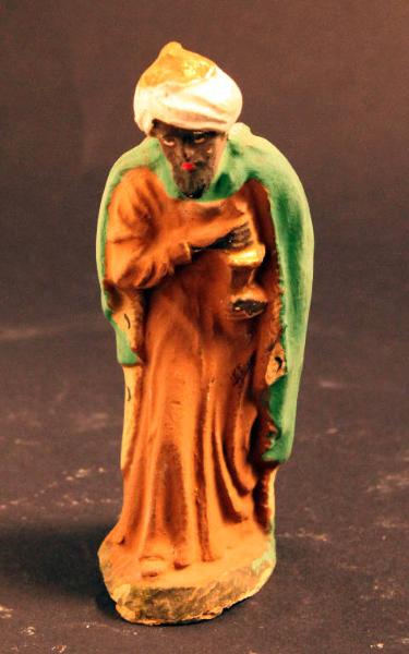 Re Magio moro con veste regali e corona sul capo. La figura reca tra le mani un dono.