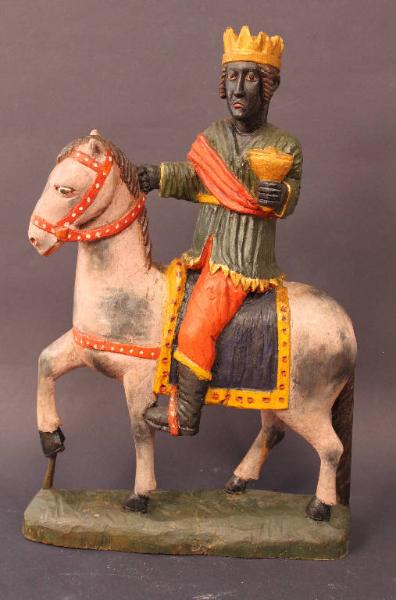 Re Magio moro in sella ad un cavallo bianco e recante nella mano snistra un dono.
