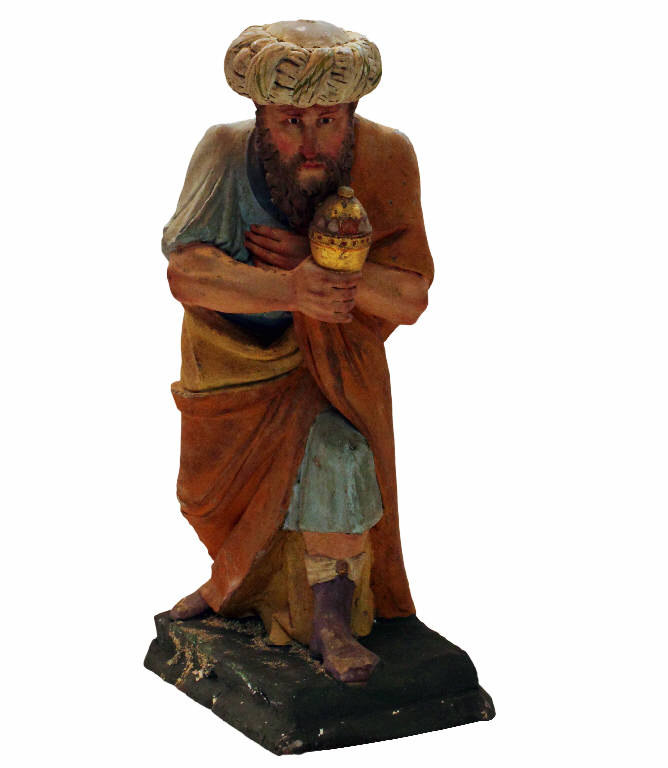 Statuetta da presepio raffigurante un Re Magio con turbante e recante un dono.