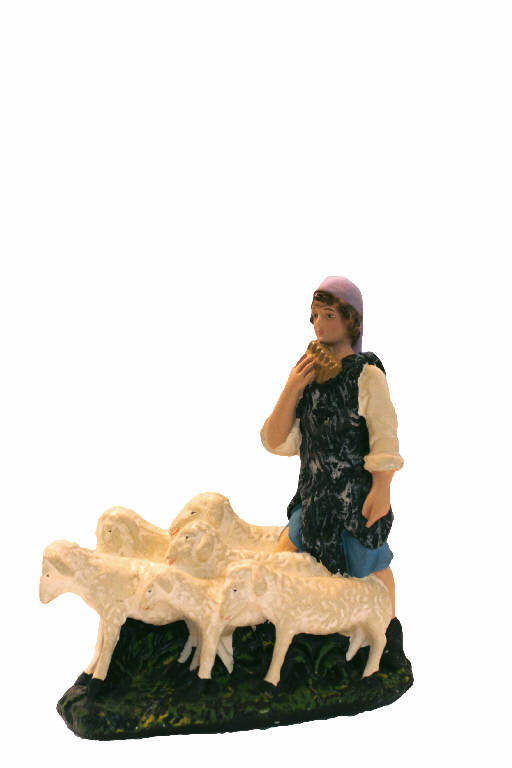 Statuetta da presepio rappresentante un pastore intento a suonare un flauto di Pan. La figura è accompagnata da un gruppo di pecore.