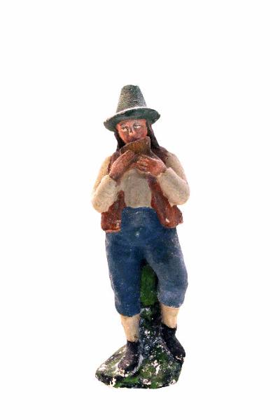 - NOTIZIE STORICO CRITICHE Statuetta da presepio rappresentante un pastore - con cappello verde, gilet verde e pantaloni blu - intento a suonare un flauto di Pan.
