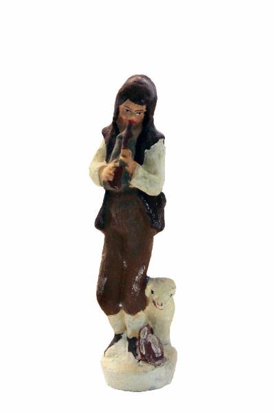- NOTIZIE STORICO CRITICHE Statuetta da presepio rappresentante un giovane pastore intento a suonare un flauto. La statuetta mostra ai piedi un agnello ed un cappello rosso.\nLa figura, nell'allestimento, è corredata da nove statuette di pecore.