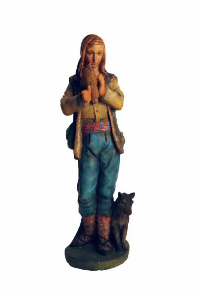 Pastore intento a suonare una cornamusa. Ai piedi alla figura vi è un cane.