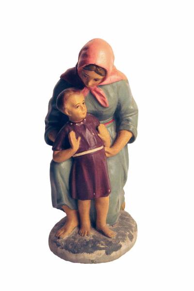 - NOTIZIE STORICO CRITICHE Statuetta raffigurante una giovane donna con foulard arancio inginocchiata e con lo sguardo rivolto ad un bambino a lei appoggiato.\nLa figura è rappresentata su di un piedistallo del tutto assimilabile a quello della statuetta della Madonna (r3040-00044).