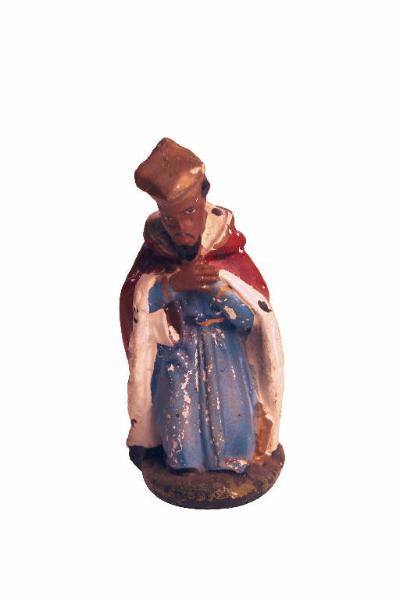 - NOTIZIE STORICO CRITICHE Statuetta da presepio raffigurante Re Magio moro, con veste azzurra e rosso, inginocchiato e con le mani al petto in atteggiamento di adorazione. Ai piedi della figura è visibile un dono.