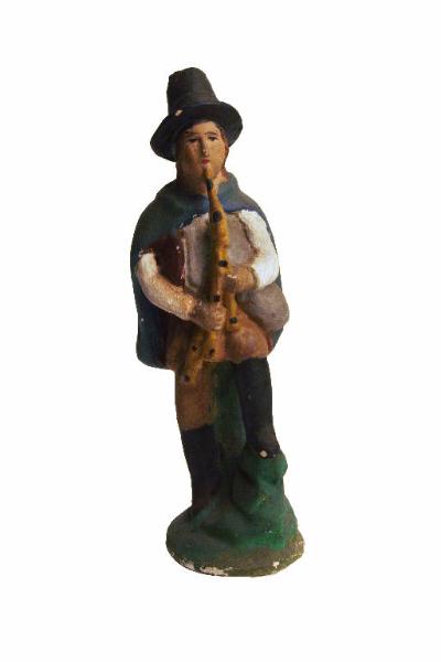 Statuetta da presepio rappresentante un pastore intento a suonare una cornamusa.