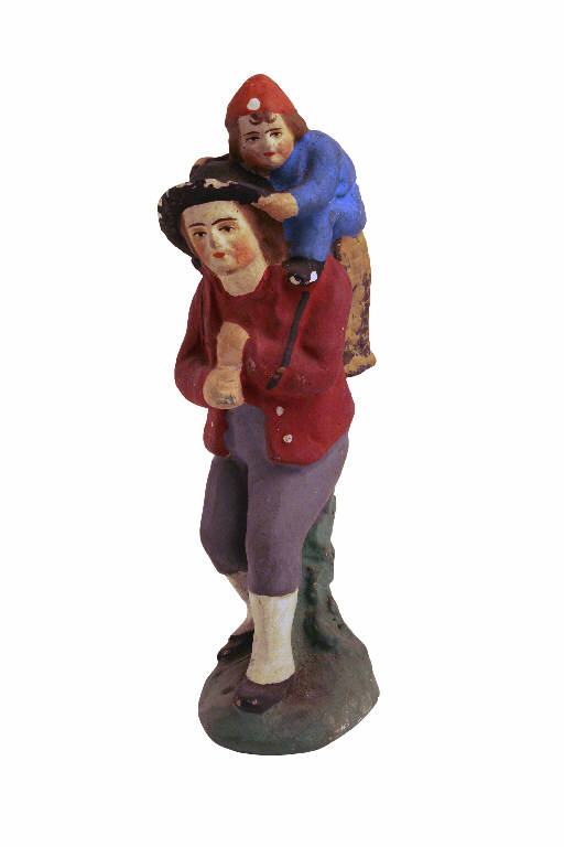 Statuetta da presepio rappresentante un giovane pastore con gerla ed un bambino.