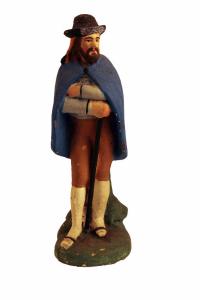 Statuetta da presepio rappresentante un pastore con bastone, cappello e mantello.