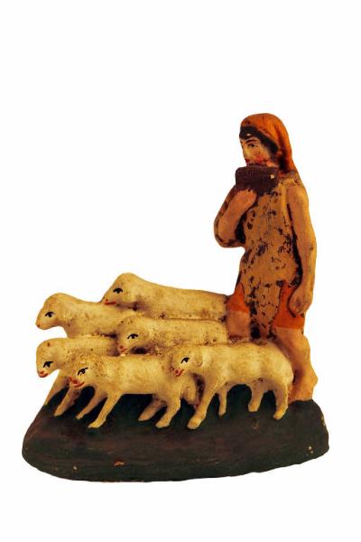 - NOTIZIE STORICO CRITICHE Statuetta da presepio rappresentante un pastore con copricapo rosso intento a suonare un flauto di Pan. Il pastore accompagna un piccolo gregge composto da sei pecore.