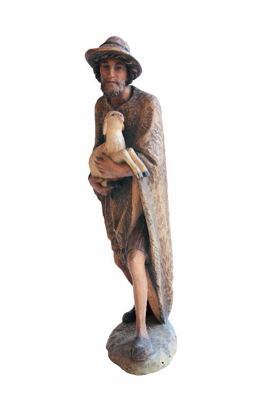 Pastore con mantello e cappello. La figura reca tra le braccia un agnello.