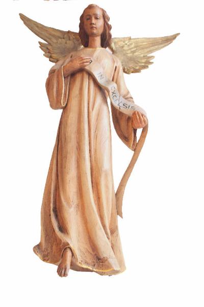 Angelo con veste rosa e grandi ali dorate recante tra le mani un cartiglio.