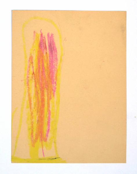 disegno a pastelli a olio colorati su cartoncino beige. Colore: viola chiaro e giallo, beige.\nIl cartone è inciso con il taglierino sul lato del disegno. Il disegno è spostato tutto sul lato sinistro del foglio.