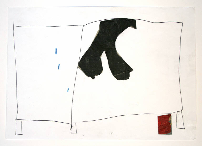 disegno a tecnica mista: collage, penna nera e matita blu su carta bianca. I pezzi del collage sono composti da cartoncino nero e cartoncino colorato a olio. Colore: nero, rosso e blu su bianco. Soggetto: progetto per tavolo.